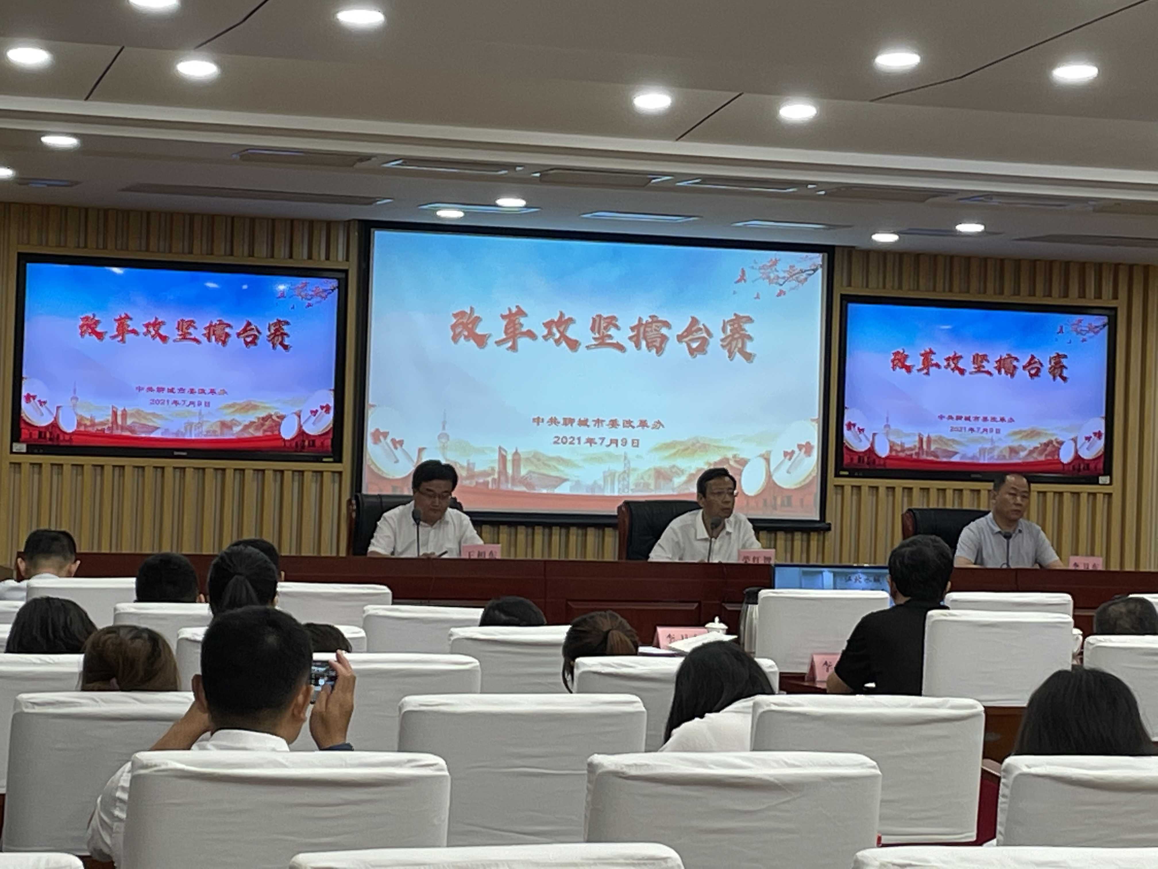 7月9日下午,中共聊城市委改革辦開(kāi)展了“改革攻堅(jiān)擂臺(tái)賽”,在全市68個(gè)改革創(chuàng)新案例中選取10個(gè)典型案例匯報(bào)展示。市委常委、秘書長(zhǎng)、改革辦主任榮紅智,省委改革辦主任李衛(wèi)東,聊城市委副秘書長(zhǎng)、政研室主任、改革辦副主任王相東,市國(guó)資委黨委委員、副主任李樹(shù)新及市直有關(guān)部門分管負(fù)責(zé)同志參會(huì),各縣(市、區(qū))設(shè)視頻分會(huì)場(chǎng)。
